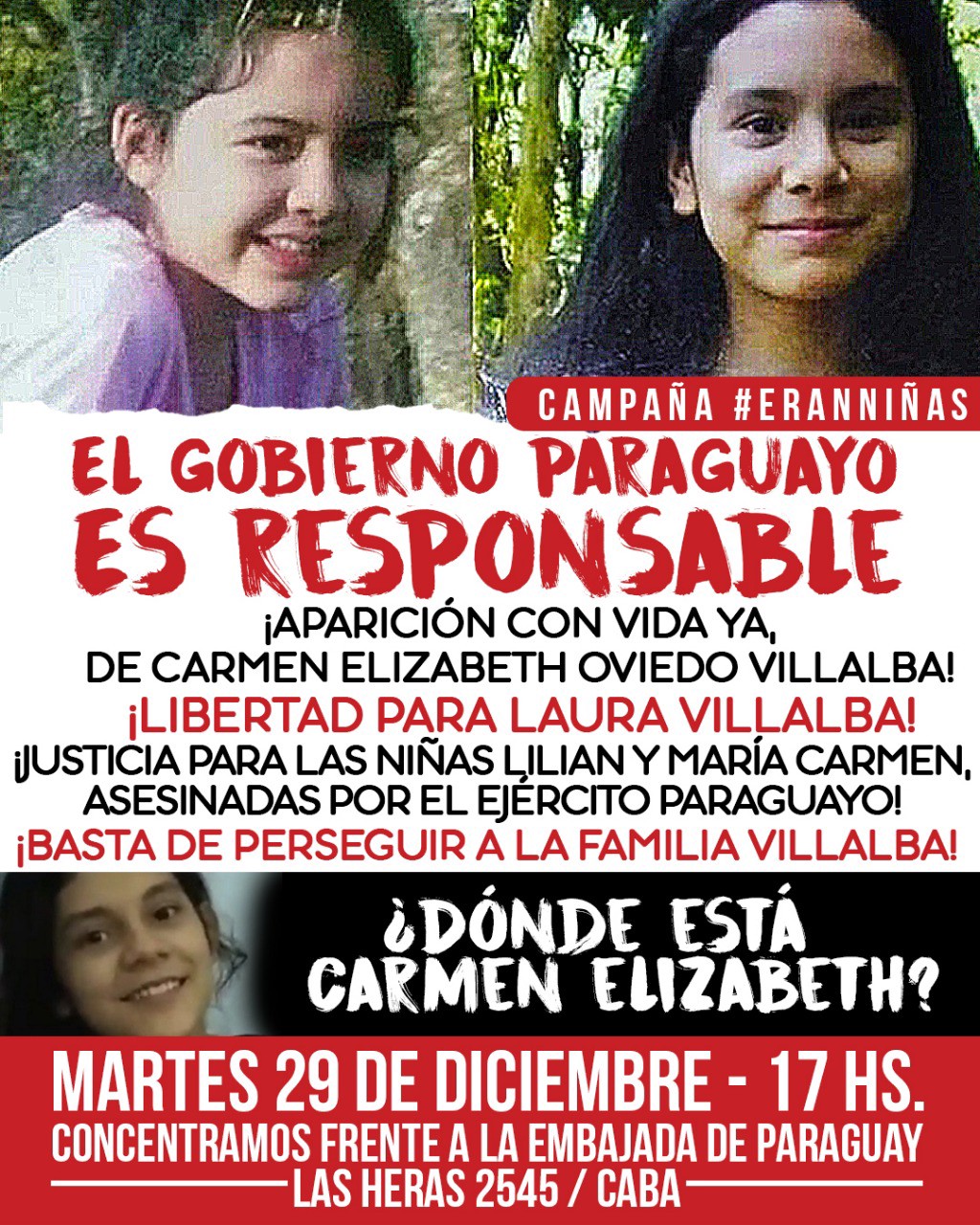 En la Conferencia de Prensa integrantes de la Campaña #EranNiñas, informaron que se exigiría que el estado paraguayo de respuesta urgente a la demanda de aparición con vida de Carmen Elizabeth Oviedo Villalba, libertad para Laura Villalba, justicia para las niñas Lilian y María Carmen, y el cese de la persecución a la familia Villalba. Se indicó también que se enviaría una carta al presidente argentino Alberto Fernández, quien tiene programado un viaje de negocios a Paraguay para solicitar que haga una demanda de informes por las niñas asesinadas y la niña desaparecida, y pedir que no se realicen negocios mientras estas violaciones a los derechos humanos no sean resueltas.