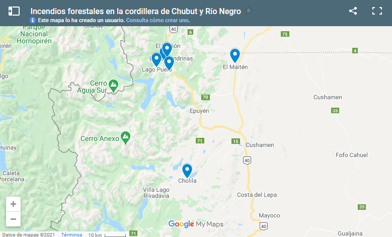 Los focos de incendio se desataron cerca de El Maitén, Cerro Radal, Las Golondrinas y Cholila, y están amenazadas las poblaciones de El Maitén, Cholila, Lago Puelo y El Hoyo. Desde el domingo avanza un frente de fuego de la zona de Mallín Cumé, al límite entre Chubut y Río Negro, que sigue fuera de control y a pocos kilómetros de El Maitén.