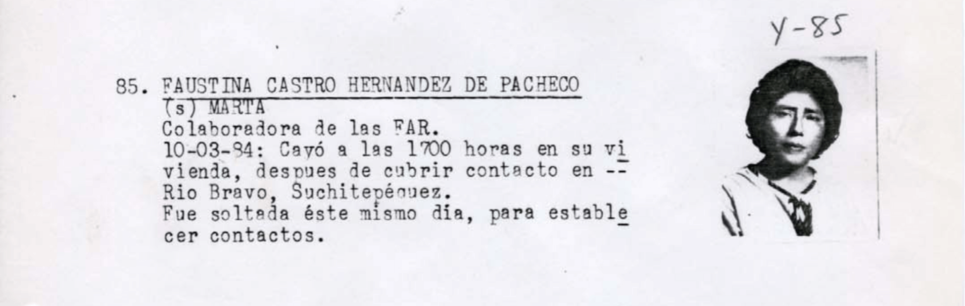 15. Rosalía López Gómez: Señalada de ser la responsable de las comunicaciones del Regional Sur con el Regional Central y miembro del Frente Guerrillero “Santos Salazar” de las FAR. Detenida el 12 de marzo de 1984 en Santa Lucía Cotzumalguapa.