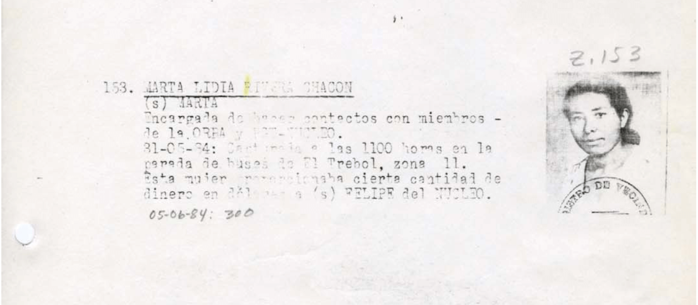 3. Marta Lidia Rivera Chacón: Señalada de hacer contactos con miembros de la ORPA y de proporcionar dinero en dólares a Felipe del Núcleo. Fue detenida el 31 de mayo de 1984 en una parada de buses de El Trébol.