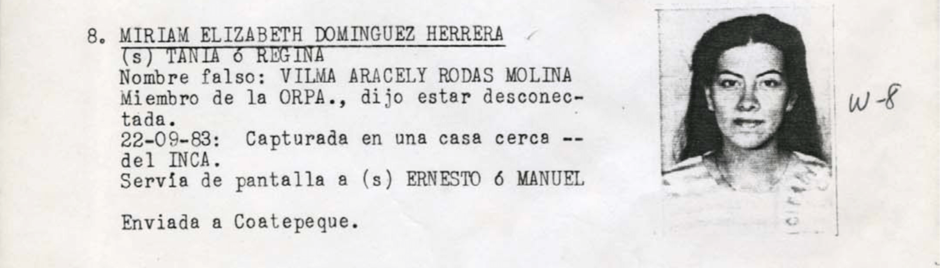 22. Miriam Elizabeth Domínguez Herrera: Señalada de ser miembro de la ORPA y ser pantalla de otros líderes. Detenida cerca del INCA el 22 de septiembre de 1983. Fue enviada a Coatepeque.