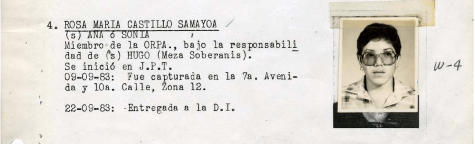 24. Rosa María Castillo Samayoa: Señalada de ser miembro de la ORPA bajo el mando de Hugo Meza Soberanis. Fue detenida en la zona 12 el 9 de septiembre de 1983.