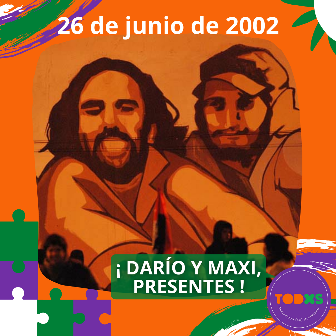 Este 26 de junio traemos a la memoria a dos compañeros imprescindibles en las luchas del pueblo, Darío Santillán y Maximiliano Kosteki, asesinados el 26 de junio de 2002 en el marco de una represión policial ordenada por el entonces gobernador de la Provincia de Buenos Aires, Felipe Solá.