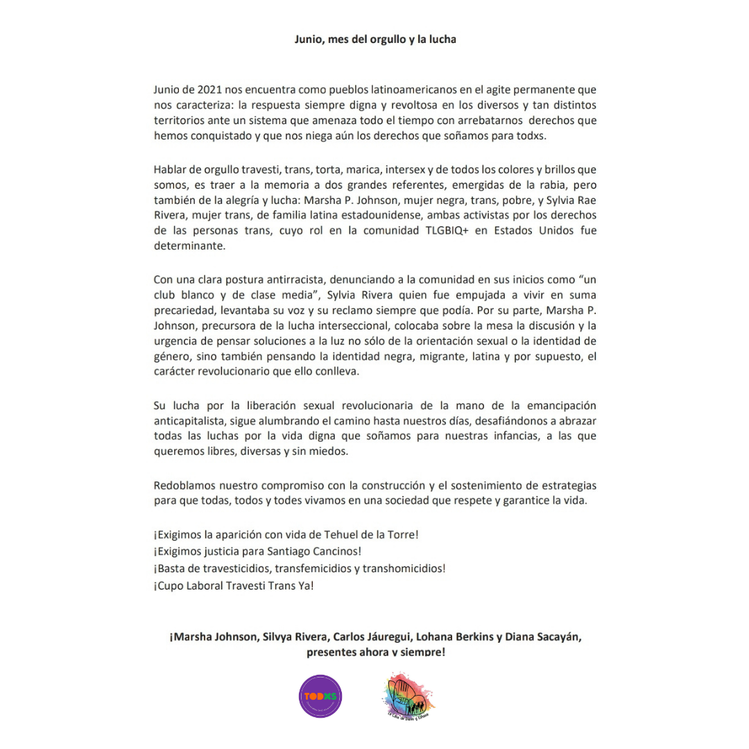 ¡Marsha Johnson, Silvya Rivera, Carlos Jáuregui, Lohana Berkins y Diana Sacayán, presentes ahora y siempre!