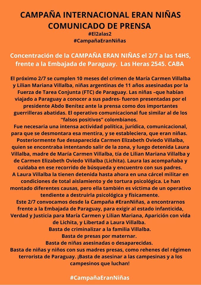 Este viernes de julio la Campaña Eran Niñas convocó a un acto político cultural a la Embajada de Paraguay, en Buenos Aires, para exigir al estado infanticida, Verdad y Justicia para María Carmen y Lilian Mariana, Aparición con vida de Lichita, y Libertad a Laura Villalba.