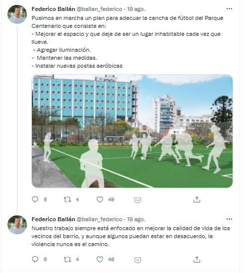 A pesar de que en el lugar no hay todavía un cartel de obra, en la noche del jueves el presidente de la Comuna 6 publicó un hilo polémico en su cuenta de Twitter. “Pusimos en marcha un plan para adecuar la cancha de futbol del Parque Centenario que consiste en mejorar el espacio”, señaló Fernando Ballán, quien agregó una imagen photoshopeada en la que se ve un suelo verde, aunque sin aclarar de qué material. También posteó otra foto en la que aparece el potrero inundado, lo cual es sorprendente, ya que la misma fue tomada en un día de sol. Por lo bajo, uno de los efectivos de la policía porteña que controlan el lugar les reconoció a los vecinos que, antes de tomar esa imagen, se abrieron unas canillas linderas a la cancha para que luzca llena de agua.