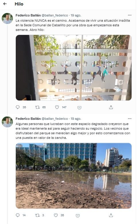 Pero la provocación llegó en los tuits siguientes, donde Ballán asegura que “algunas personas que lucraban con este espacio degradado creyeron que era ideal mantenerla así para seguir haciendo su negocio”. Una acusación ofensiva que no está respaldada con ningún argumento: ¿de qué negocios habla? Todos los que frecuentan el Parque, y en especial su potrero, dan fe de que el lugar es de acceso público y gratuito. Para rematar, Ballán acusó que “la violencia NUNCA (sic) es el camino, acabamos de vivir una situación insólita en la Sede Comunal de Caballito”. La foto parece ilustrada con cascotes en la puerta de la Comuna, aunque en realidad se trataba de pedazos de tierra que los vecinos sacaron del potrero y llevaron hasta allí.