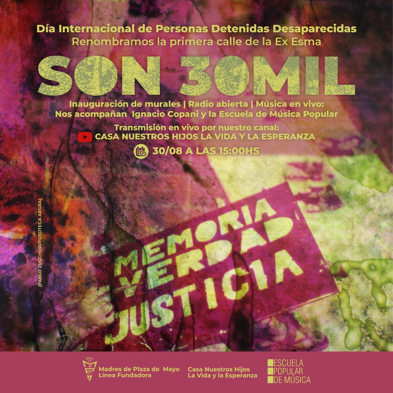 En virtud de ello, este 30 de agosto de 2021, vamos a RENOMBRAR por primera vez una de las calles del predio de la Ex Esma, que aun conservan los nombres que les otorgaron los militares, con el nombre “SON 30.000”.