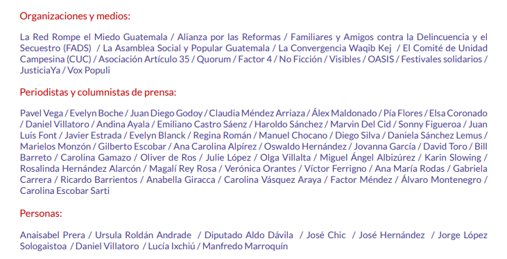 Ante este panorama, condenamos enérgicamente la persecución a periodistas, la obstaculización y censura a la libertad de expresión por medio de los allanamientos a la viviendas de Juan Bautista y Carlos Choc de Prensa Comunitaria, así como a las instalaciones de la Federación Guatemalteca de Escuelas Radiofónicas (FGER), la Radio Kamolbé y Radio comunitaria indígena Xyaab Tzuultaq’a, ocurridas recientemente.