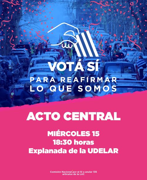 Este miércoles, se llevara a cabo el acto por la derogación de la Ley de Urgente Consideración , en la explanada de la Universidad a las 18:30hs. La convocatoria coincide con la primera semana después de confirmada por la Corte Electoral que se validaron las firmas necesarias para llevar a referéndum 135 artículos de la LUC.