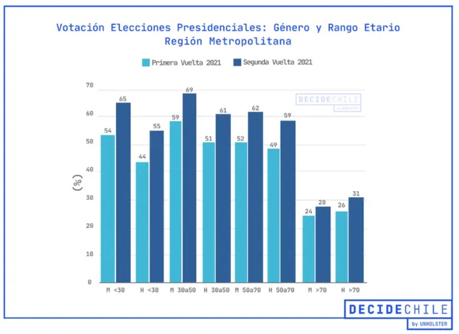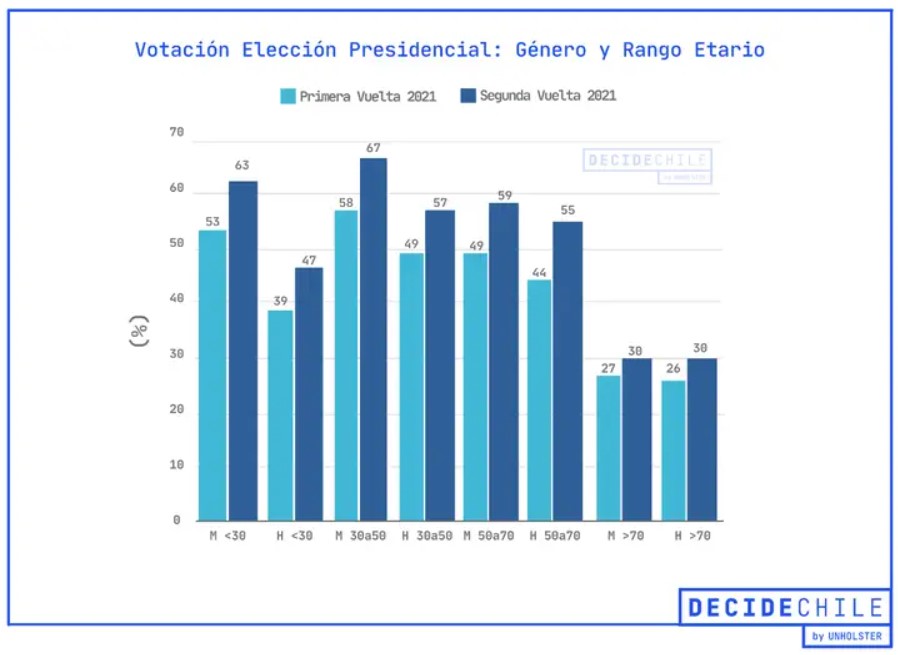 De acuerdo con los datos de Decide Chile, si en la primera vuelta había votado el 53% de las mujeres menores de 30 años y el 58% de las que tenían entre 30 y 50 años, ambas cifras subieron casi diez puntos en el balotaje, llegando al 63% y 67%, respectivamente. Además, en ambos casos hay una brecha grande respecto a la participación masculina: aunque ésta aumentó en ocho puntos respecto a la elección de noviembre, se mantuvo en 47% y 57%, 16 y 10 puntos menos que el género femenino, respectivamente.