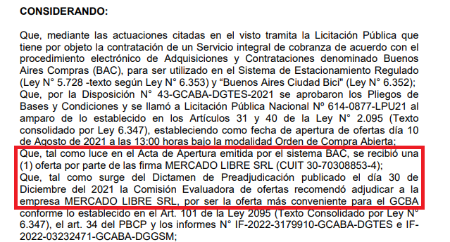 El proceso llevado adelante fue una licitación hecha a medida, dado que solo se presentó Mercado Libre a la contienda pública como señala el mismo texto difundido: “tal como luce en el Acta de Apertura emitida por el sistema BAC, se recibió una (1) oferta por parte de las firma MERCADO LIBRE SRL (CUIT 30-70308853-4); Que, tal como surge del Dictamen de Preadjudicación publicado el día 30 de Diciembre del 2021 la Comisión Evaluadora de ofertas recomendó adjudicar a la empresa MERCADO LIBRE SRL”. De esta manera y por un plazo de 36 meses, Marcos Galperin, CEO de Mercado Libre, le cobrará a todos los porteños y porteñas, cada vez que deseen estacionar su auto y utilicen las bicicletas