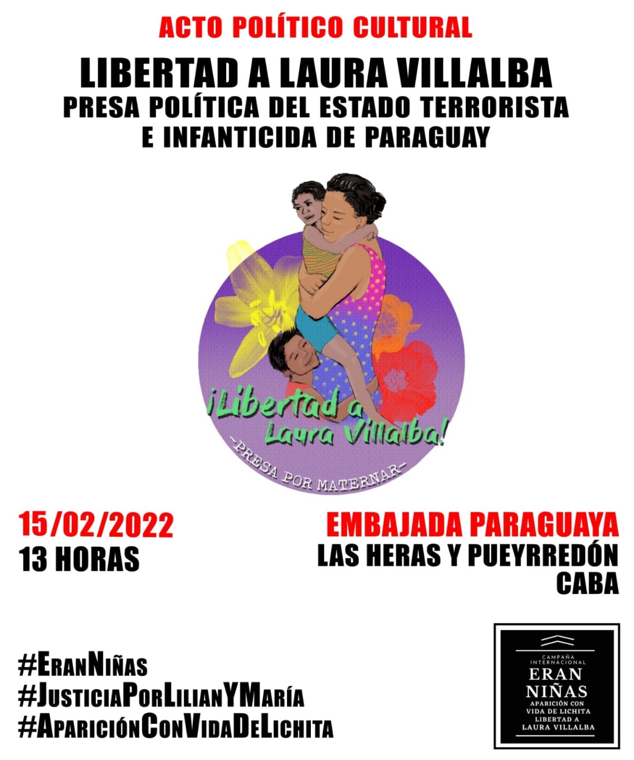 El próximo 15 de febrero de 2022 a las 13 hs desde la Campaña Internacional Eran Niñas, convocan a congregarse frente a la Embajada de Paraguay en CABA (Las Heras y Pueyrredón) para exigir la libertad de Laura Villalba, detenida injustamente hace más de un año.