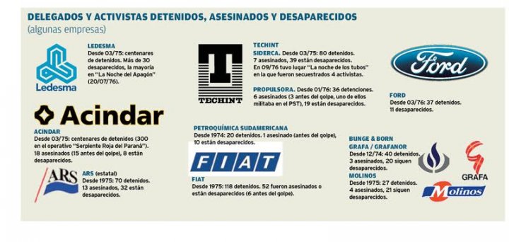 Cientos de testimonios dan cuenta de la participación de empresarios como los de Techint, Ford, Acindar, Arcor, Mercedes Benz, Astra, Celulosa, Bunge y Born, Astilleros Astarsa y Río Santiago, Aluar, Fate, La Veloz del Norte, Pérez Companc, Fortabat, Garovaglio y Zorraquín, Pescarmona, Bulgheroni, Vicentín, Blaquier (Ingenio Ledesma), Las Marías (Taragüí), La Nueva Provincia, Clarín y La Nación, en un verdadero plan ideado para matar a delegados y activistas “molestos” y aterrorizar al resto.