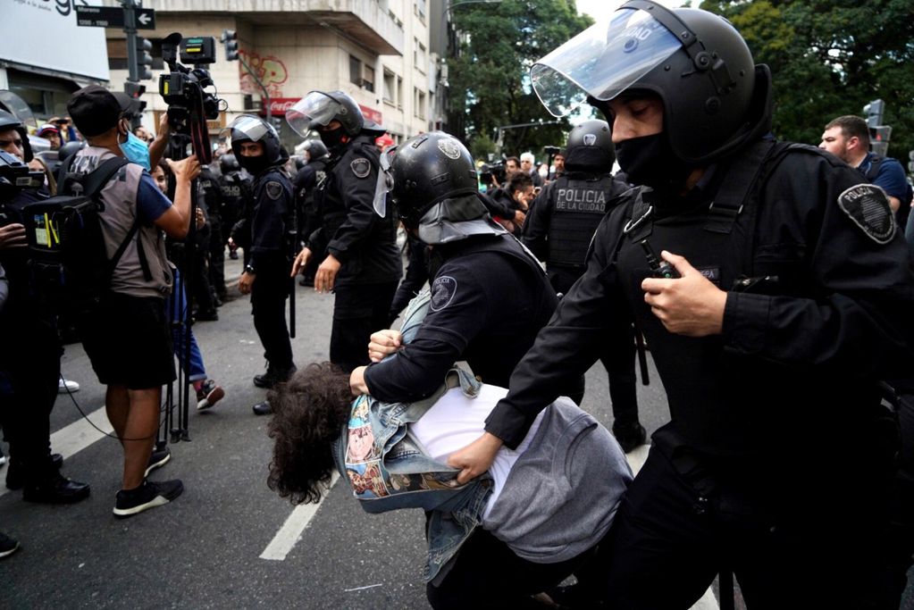 Los enfrentamientos cuerpo a cuerpo entre las fuerzas policiales locales y medio centenar de manifestantes se desarrollaron a raíz del corte total de la calle Lima, que bordea a la Nueve de Julio, en un operativo que incluyó la detención de algunas personas.