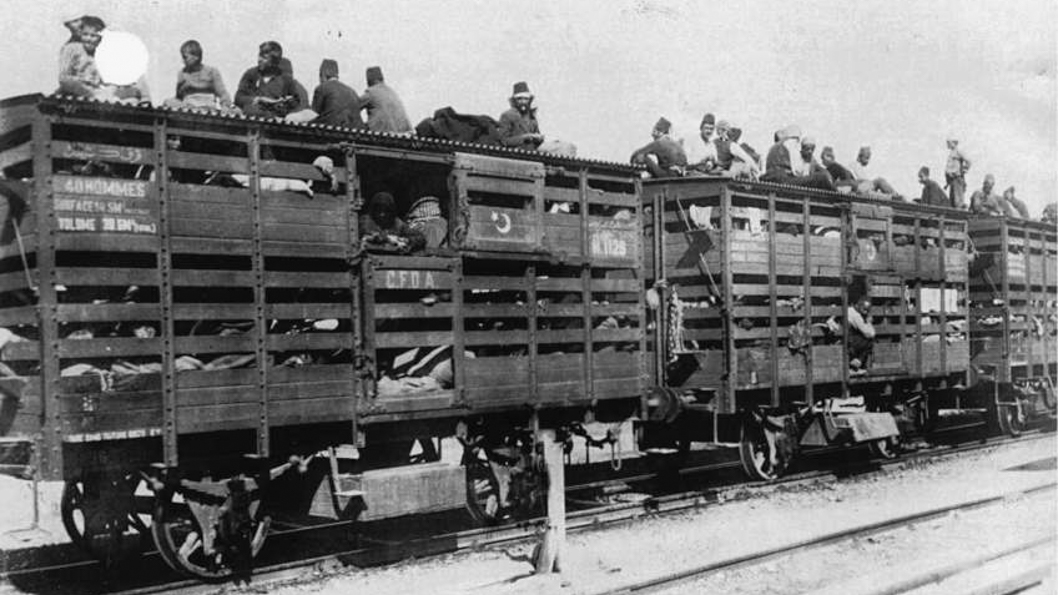 (Imagen: Revista Livertá. Familias armenias siendo desterradas en vagones de transporte de ganado. Anatolia, 30 de octubre de 1915)