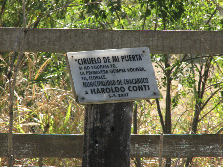 Y sí, enumeremos: el jardín de infantes 908 que lleva su nombre, una calle mitad asfalto mitad tierra allá por atrás del anexo del Club Social, ese mismo club en el que te recibe una escultura del tío Agustín que tiene un pie atrapado en la tierra pero que se desvive por salir corriendo con destino a Bragado y escuchar en su larga corrida el canto del álamo carolina. Hay más: la Casa de la Cultura con su nombre, un Basilio Argimón de hierro que se construye de a poco en un taller metalúrgico, concursos literarios, unos murales al lado de la intendencia municipal con un Haroldo alado y una placa que dice: “Ciruelo de mi puerta, si no volviese yo, la primavera siempre volverá. Tú, florece”, ese poema anónimo japonés citado por Conti en su cuento “La balada del álamo carolina”.