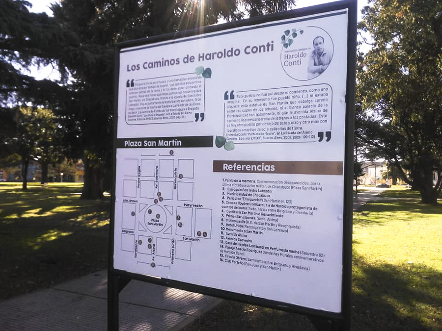 Secretaria de Cultura municipal entre 2011 y 2015, acompañó desde ese rol el surgimiento de la institución. Y en 2016 sintió que necesitaba un espacio de participación: lo encontró en esa Asociación de Amigos. Por teléfono, en una conversación que sortea esos 200 kilómetros que distan entre Chacabuco y Buenos Aires, habla con entusiasmo de los proyectos que llevan adelante. Está orgullosa de “Los caminos de Haroldo”, el proyecto que preserva y señaliza lugares emblemáticos en la biografía y la bibliografía de Conti en su ciudad natal, desde la plaza principal hasta el álamo del campo Los Pumas.