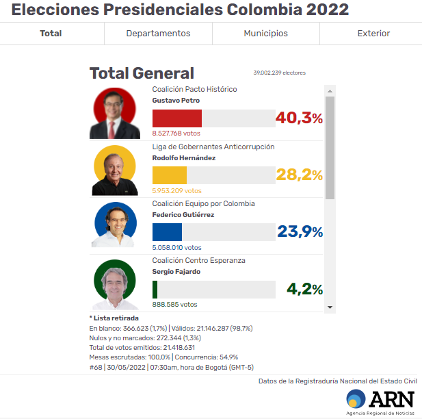 Gustavo Petro ganó la primera vuelta en Colombia el domingo 29 de junio. Obtuvo 40.34% con 8.523.554 votos, y deberá enfrentarse el 19 de junio en segunda vuelta a Rodolfo Hernández que sacó 28.17% con 5.951.901 votos, dejando en un tercer lugar a Federico “Fico” Gutiérrez, quien alcanzó 23.87% con 5.504.120 votos. Lejos, en un cuarto lugar, quedó Sergio Fajardo, con 4.20% para un total de 888.051 votos.