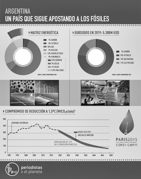 Según los datos del Energy Policy Tracker, citados por Climate Transparency 2021, Argentina destinó al menos US$1.360 millones a la energía procedente de combustibles fósiles en 2020, esto como parte de sus compromisos de financiación relacionados con la energía y la respuesta económica al COVID-19.