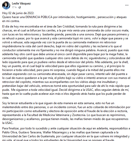 A 37 días del inicio de la resistencia de la comunidad universitaria, en rechazo al fraude para elegir rector de la Universidad de San Carlos de Guatemala (USAC), se denuncian hechos de intimidación, que tendrían la finalidad de desarticular la resistencia iniciada el 27 de abril y que se ha ido multiplicando a nivel nacional, aglutinando a estudiantes, docentes, personal administrativo, de servicios y egresados, al que también se han unido organizaciones de la sociedad civil.