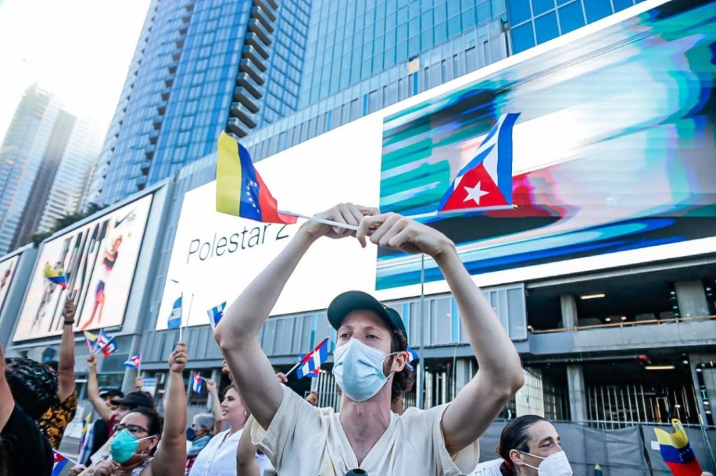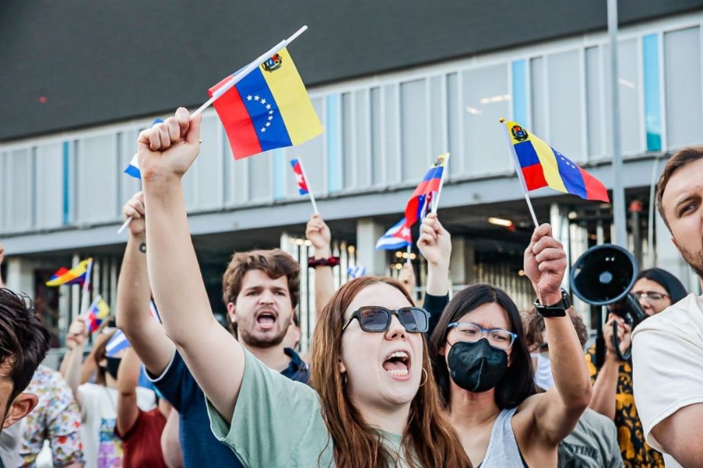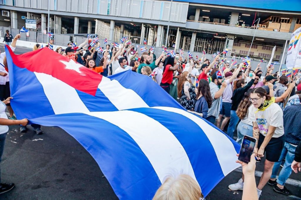 Frente a vallas negras que aseguran el lugar de la reunión se apostaron los asistentes enarbolando banderas de Cuba, Venezuela y Nicaragua, así como pancartas que piden el fin de la desestabilización promovida desde Washington, mientras con cantos enérgicos cuestionaban la democracia «Made in USA».