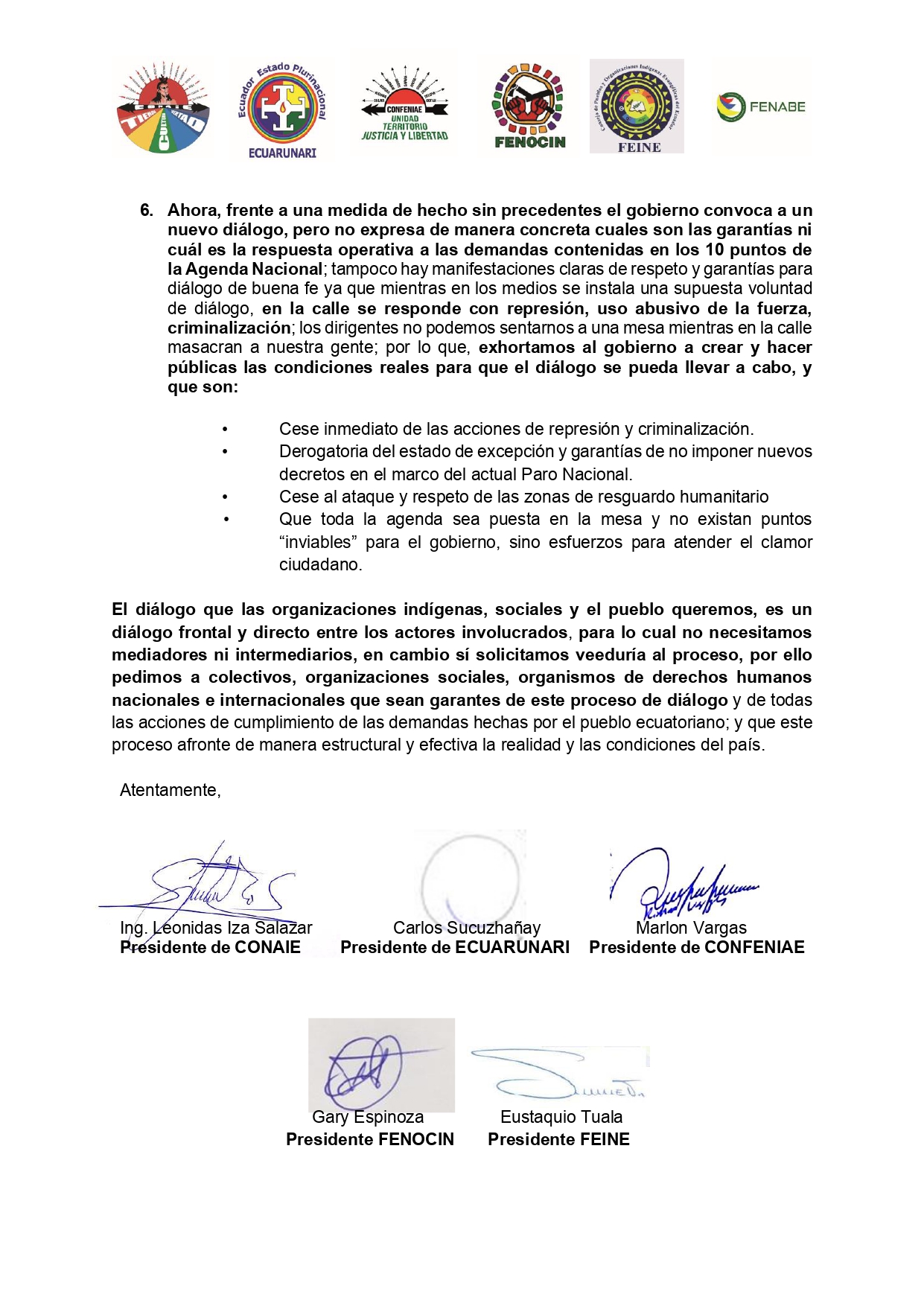 La CONAIE y organizaciones sociales dan un pronunciamiento en el décimo día del Paro Nacional