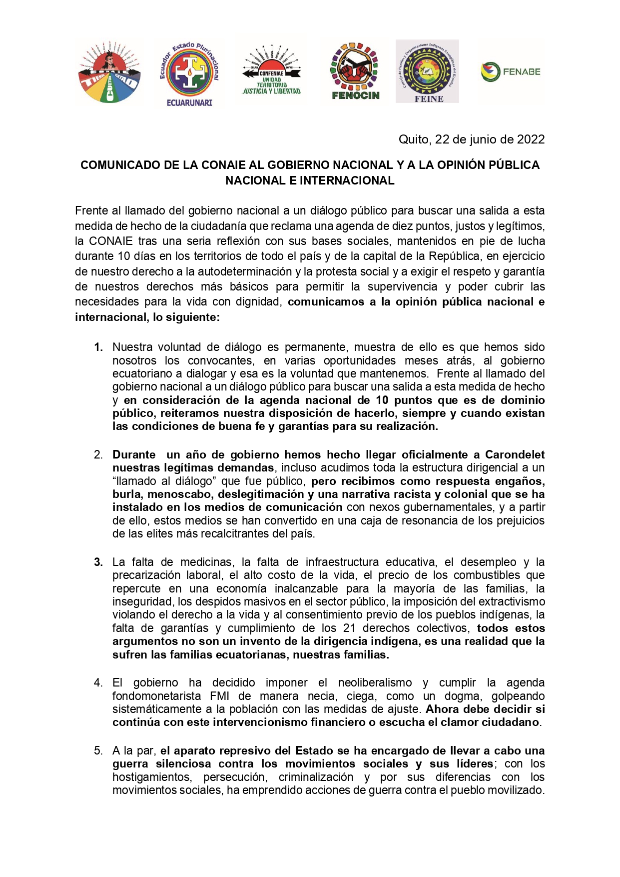 Guillermo Lasso no ha escuchado el clamor popular, solo responde con represión y violencia. Urge que la Comisión Interamericana de Derechos Humanos se pronuncie frente a la vulneración de derechos humanos en #Ecuador