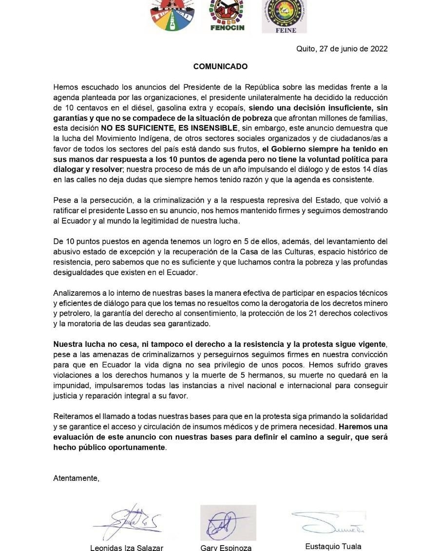 La Conferencia Nacional de Nacionalidades Indígenas (Conaie), convocante de las protestas, todavía no ha comentado sobre el nuevo paso de Lasso. El movimiento reclama al Gobierno 10 puntos, entre ellos no firmar tratados de libre comercio que “destruyan la producción nacional”, y asegura que se mantendrá en pie de la lucha hasta la materialización de todas sus demandas.