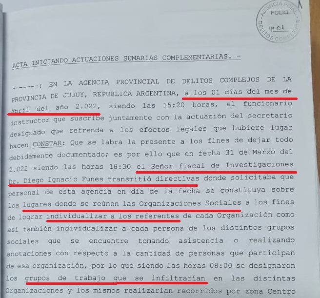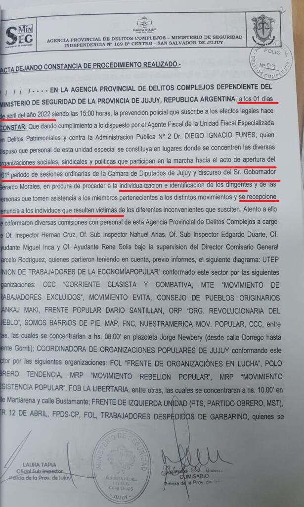 Las organizaciones sociales que sufrieron los allanamientos del 6 de julio pasado revelaron que el Poder Judicial le ordenó a las fuerzas de seguridad infiltrarse en sus filas para identificar a los principales referentes, según consta en el expediente, donde se los denomina «grupos de trabajo». Las tareas de inteligencia se habían iniciado en la movilización del 1° de abril en el marco del discurso del gobernador Gerardo Morales en la apertura de sesiones ordinarias de la Legislatura.