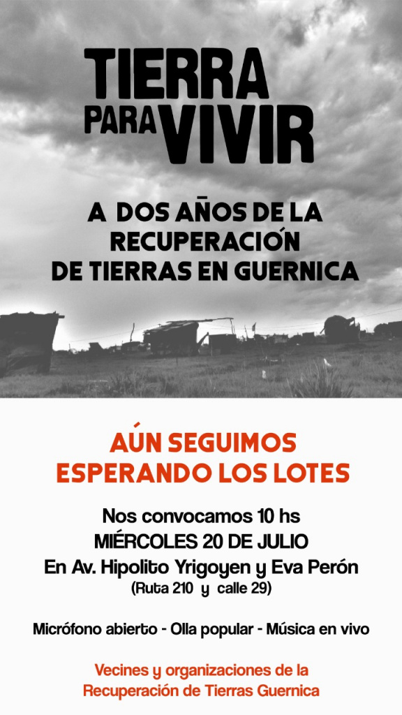 Vecines y organizaciones de la Recuperación de Tierras de Guernica se convocan este miércoles 20 de julio, a partir de las 10, en Avenida Hipólito Yrigoyen y Eva Perón, Ruta 210 y Calle 29. Habrá micrófono abierto, olla popular y música en vivo. Advierten que a dos años, siguen sin la tierra y esperando los lotes. Compartimos comunicado.