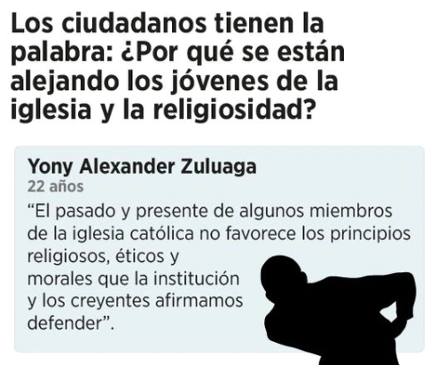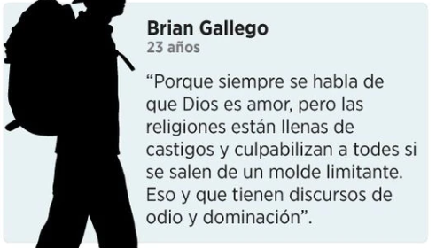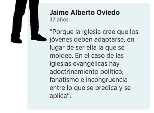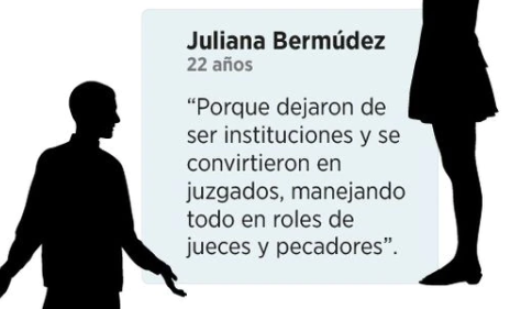 Este aspecto lleva a cuestionar: ¿por qué los jóvenes se están alejando de las prácticas religiosas? Desde la sección Bogotá de El Espectador realizamos un sondeo a 45 jóvenes de diferentes regiones. Su respuesta global es que no se sienten identificados con las posturas cerradas en materia de feminismo y participación de las mujeres, homosexualidad, aborto, facultades morales e incluso restricciones en ámbitos como el goce de la vida sexual.