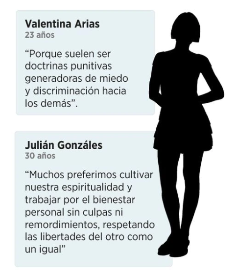 A su vez, en las respuestas recopiladas por este medio se encontró que la mayoría de los jóvenes buscan darle sentido a su vida, creyendo en un ser o designio superior sin ligarse a dogmas. En esa misma línea han surgido nuevas corrientes religiosas, que son más amigables con la modernidad y los temas que se ubican en la agenda de debate en el mundo.