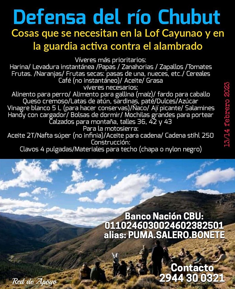 Entretanto, la Red de Apoyo, integrada por vecinxs mapuche y no mapuche, que ayuda a las comunidades violentadas por el Estado y por privados, organiza en la warria (ciudad) la ayuda que puede, inicia acciones legales y denuncia, redacta pedidos de ayuda a Asambleas y organizaciones sociales y de derechos humanos, se organiza como relevo para subir a la veranada y gestiona víveres. Otro tanto hace el Movimiento de Mujeres y Disidencias Originarias por el Buen Vivir, sumando partes de prensa, consiguiendo recursos y aportando toda su experiencia legal y relaciones con organizaciones hermanas de otros territorios en resistencia.