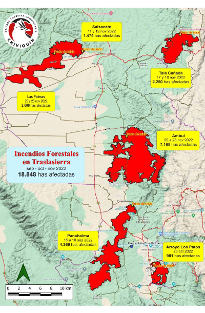 Las miles de hectáreas perdidas entre el 15 de septiembre del 2022 y el 28 de noviembre del mismo año contenían una biodiversidad nativa que habitaba entre monte leñoso, arbustal y pastizal, y que hoy lucha por regenerarse. “Esto incluye únicamente los incendios forestales (IIFF) de Panaholma, Arroyo Los Patos, Salsacate, Tala Cañada, Las Palmas y Ambul. Pero hubo muchos otros, como el ocurrido a principios de octubre en el Parque Nacional Quebrada del Condorito, en el campo que pertenece al ya varias veces imputado Alejandro Javier Becerra”, publicaron desde Chiviquín.