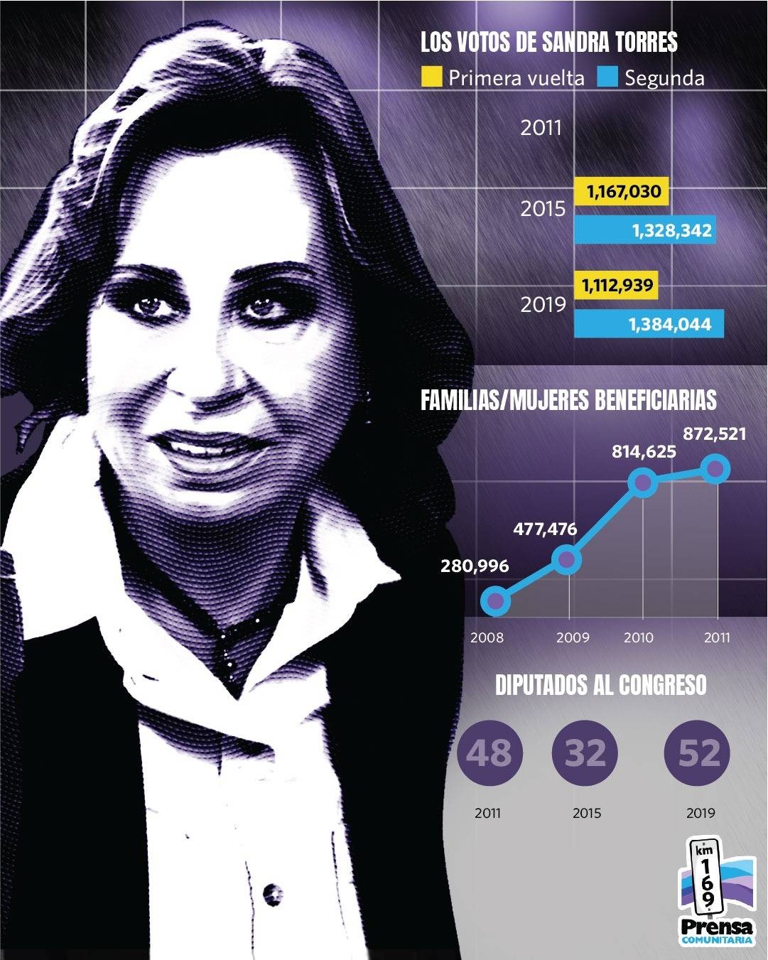 En 2019 Torres obtuvo en la primera vuelta 1 millón 112 mil 939 votos frente a 608 mil 83 votos de Giammattei, es decir cerca de la mitad de votos en la primera vuelta, sin embargo, en la segunda vuelta en donde solo competían Giammattei y Torres, la tendencia se revirtió y Giammattei obtuvo más de 1 millón 299 mil votos más, mientras Torres solo logró poco más de 271 mil votos más.