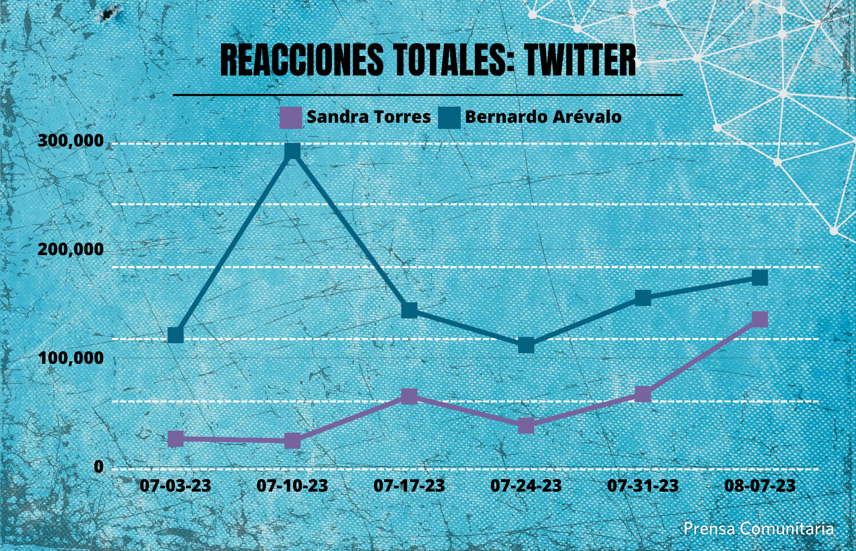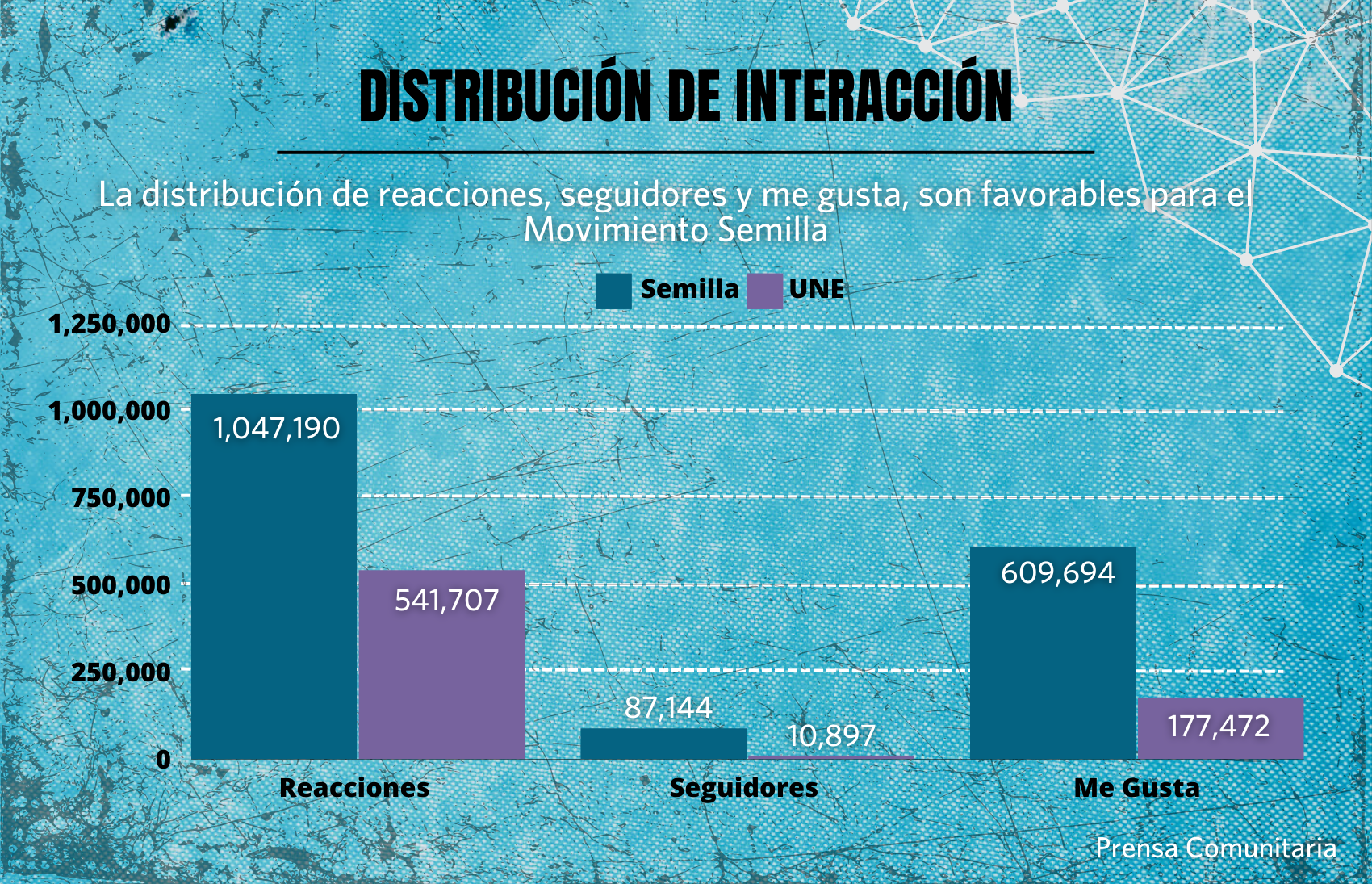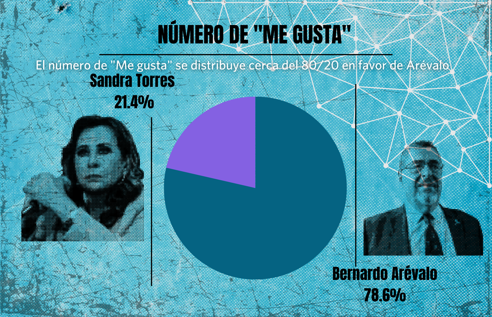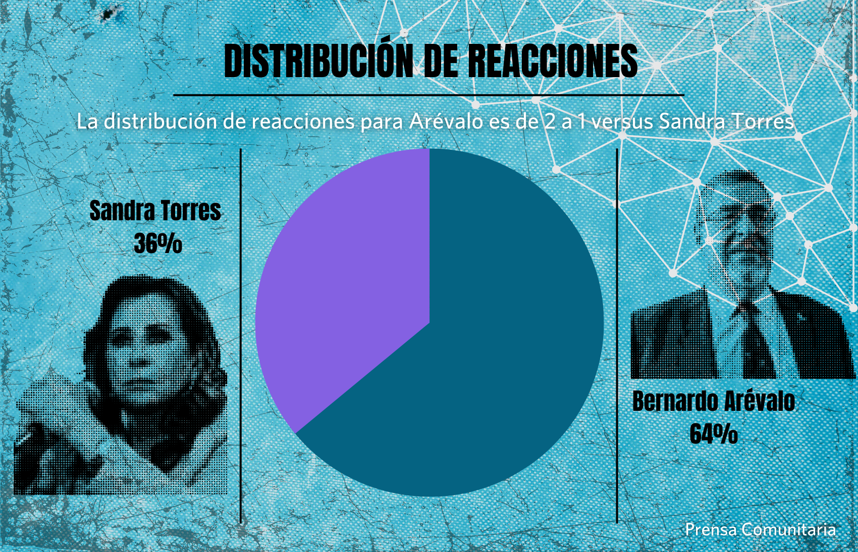 Cuando se realiza la sumatoria de interacciones en las tres redes sociales, Arévalo se lleva dos de cada tres reacciones y Torres se queda con una, lo cual también se puede representar como que el 64 por ciento de los likes, comentarios o compartidos son a publicaciones del candidato de Semilla y el 36 por ciento para la de la UNE.