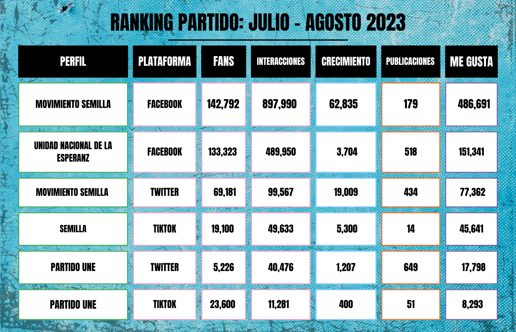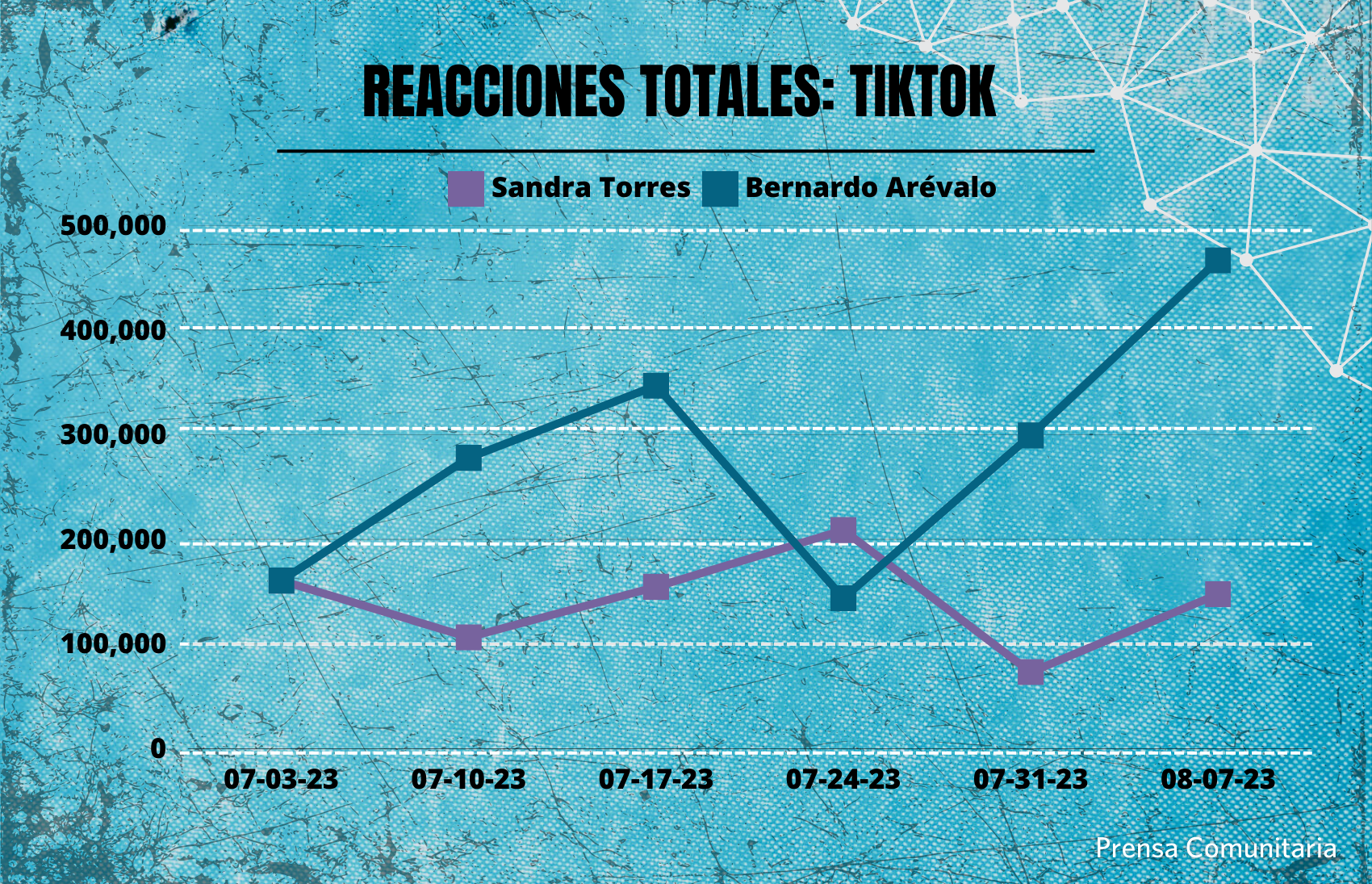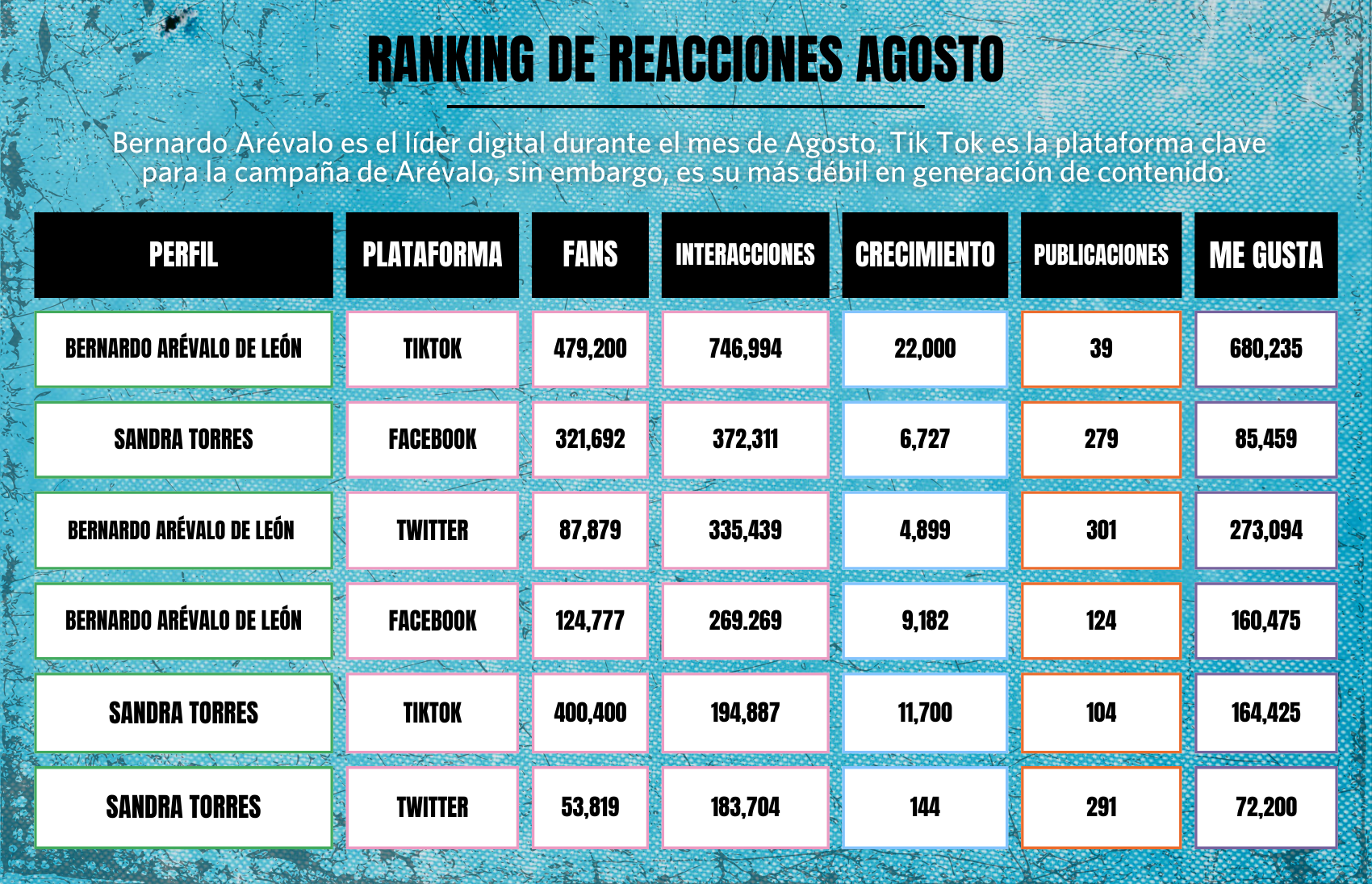 Pese a que Arévalo registra solamente 39 publicaciones en agosto, creció 22 mil seguidores y obtuvo casi 747 mil reacciones, comentarios o compartidos en Tiktok, mientras que Torres, con más del doble de publicaciones no logró captar ni el 30 por ciento de las interacciones que obtuvo el candidato de Semilla.