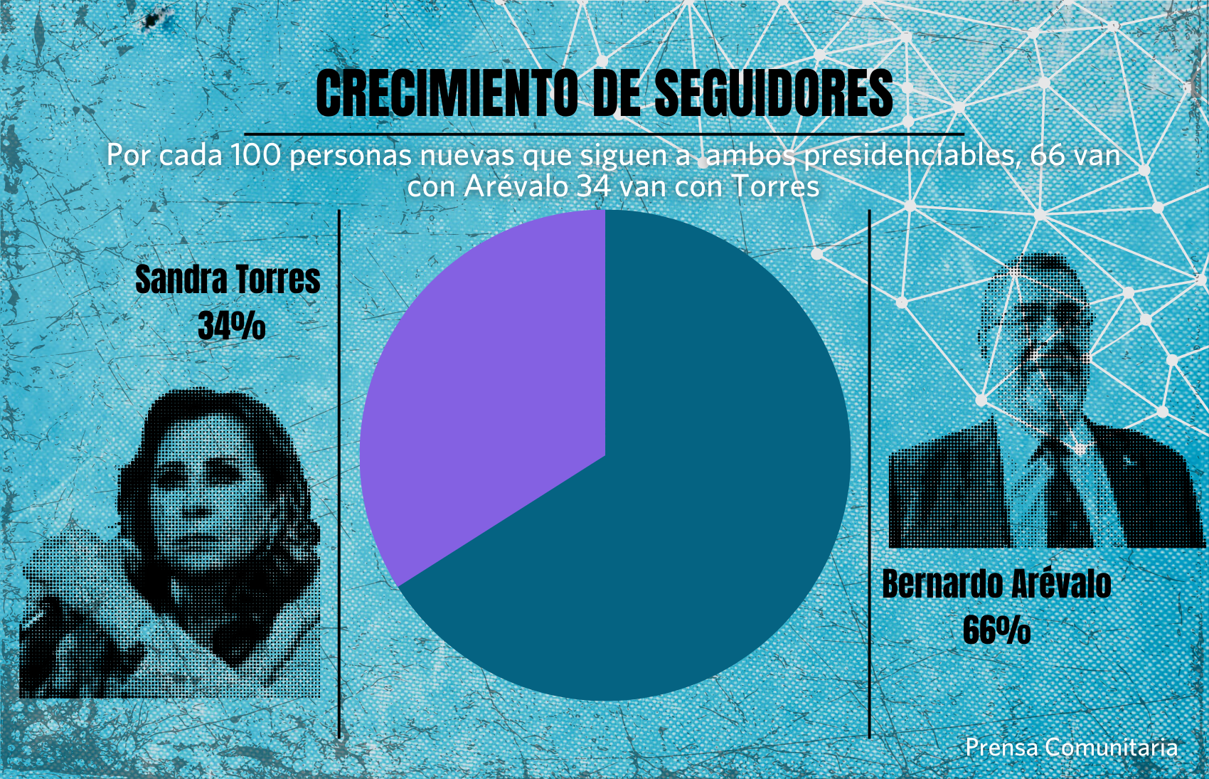 Exactamente la misma relación se mantiene en el crecimiento de seguidores, ya que en agosto de cada 100 personas que decidieron seguir a un político, 66 optaron por Arévalo y solamente 34 decidieron seguir a Torres.