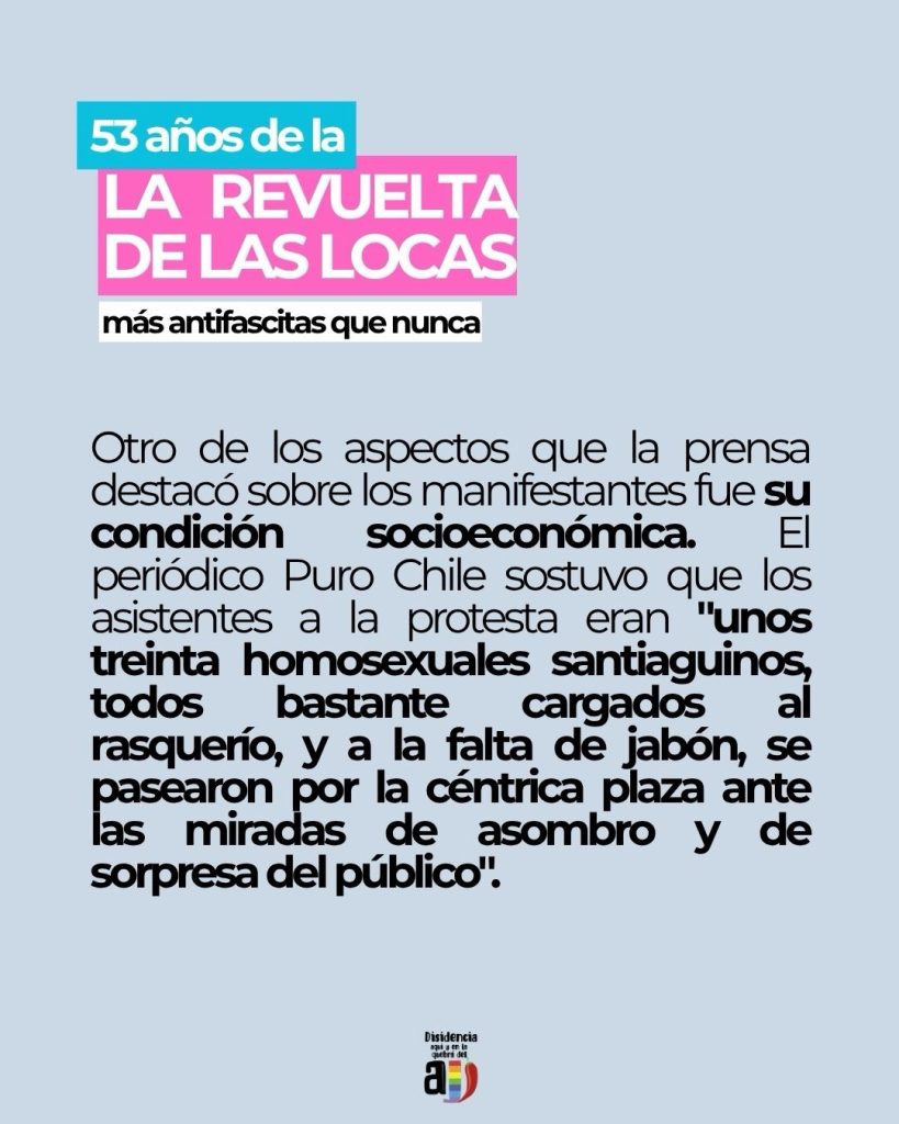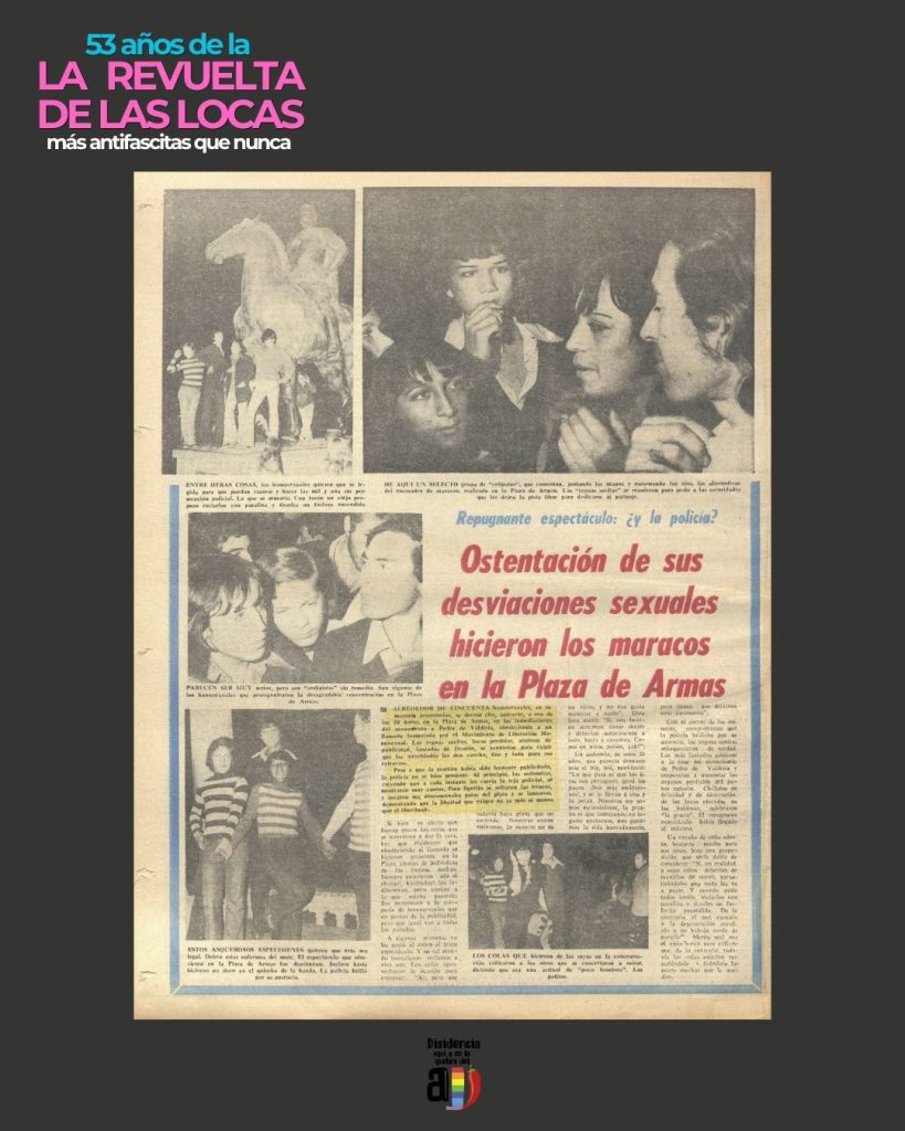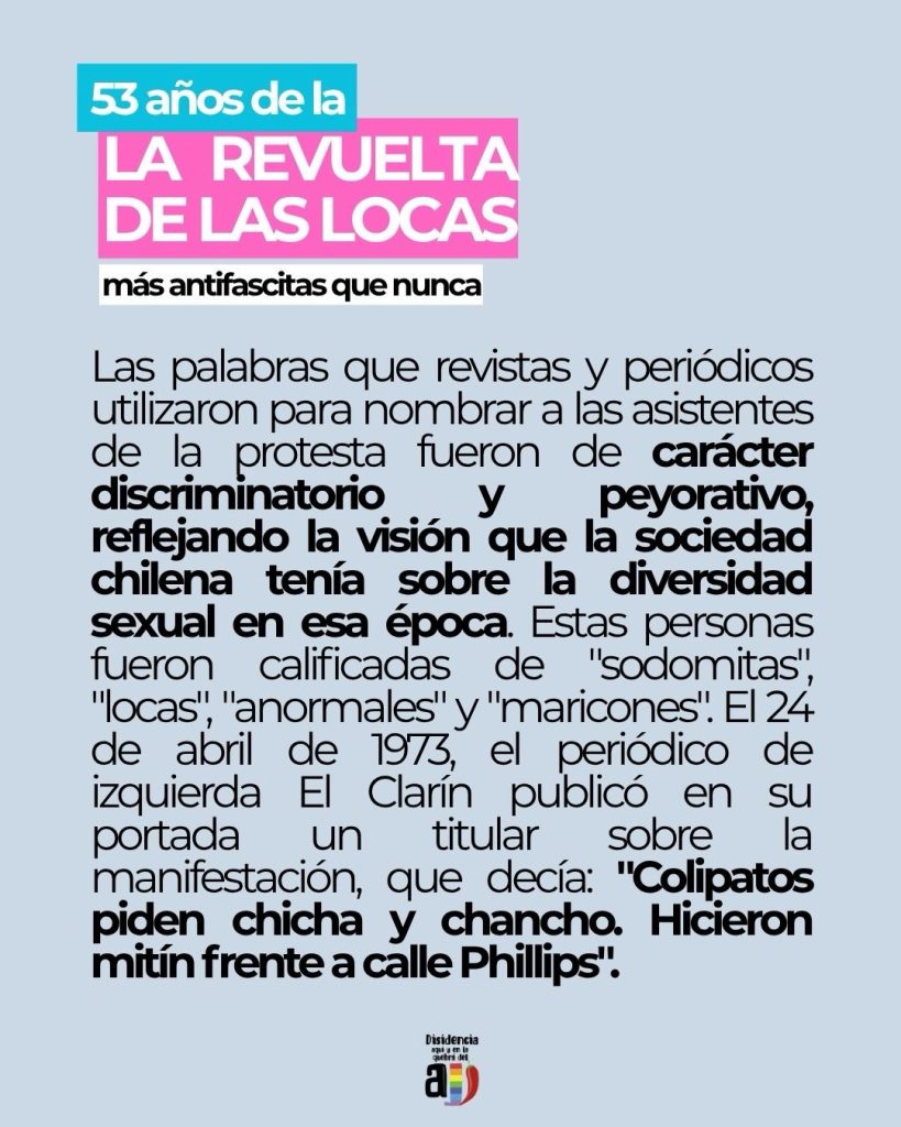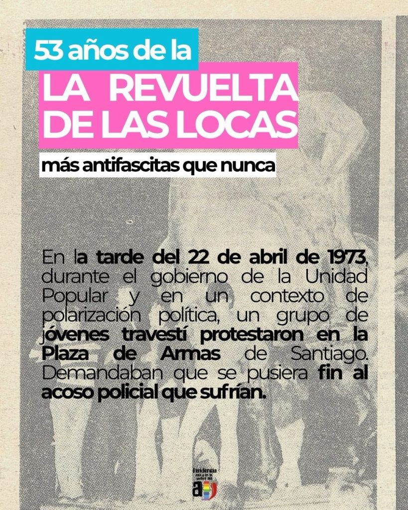 🇨🇱 Este miércoles (22/04), en Santiago de Chile y otras ciudades del país trasandino habrá diversas convocatorias para conmemorar y celebrar los 53 años de La Revuelta de Las Locas, la primera movilización en defensa de los derechos de la población LGTBIQ+.