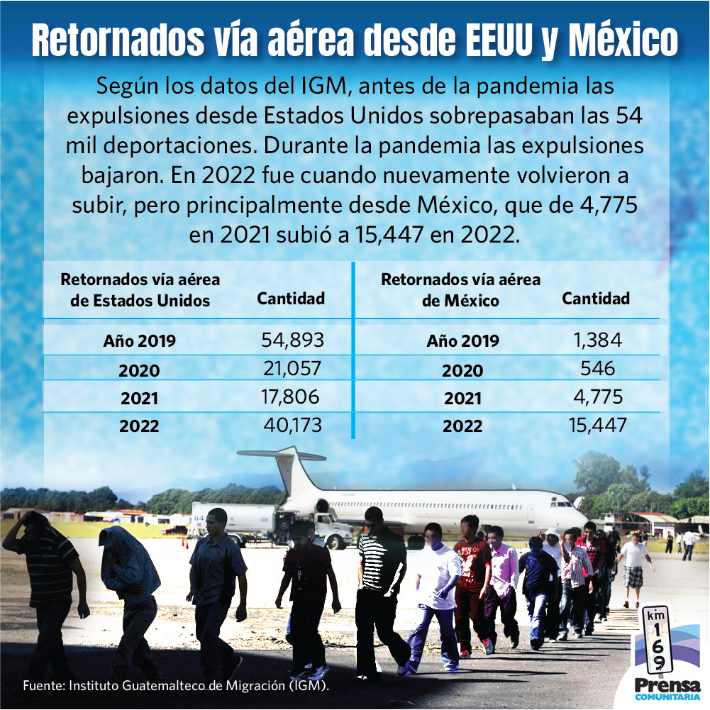 Por su parte, el Instituto Guatemalteco de Migración (IGM) reportó que desde México han sido expulsados vía aérea del 1 de enero al 30 de marzo de 2023, 3942 personas guatemaltecas en 30 vuelos. Por la vía terrestre han sido deportados a Guatemala, 7,009 migrantes.